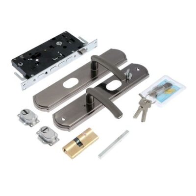 Комплект замка для китайской двери R=2R, с ц/м, с ручками, правый. Комплект замка для китайской двери предназначен для установки на дверные полотна китайского производства. Межосевое расстояние составляет 68 мм, бэксет – 60 мм. Дверные ручки литые, изготовлены из алюминия. Планки и корпус замка производятся из стали. Замок оснащен тремя ригелями овального сечения из закаленной стали. Данный комплект замка подходит для дверей правого открывания.