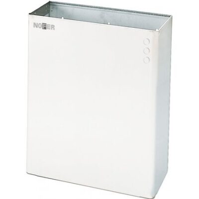 Настенная урна для мусора без крышки из нержавеющей стали AISI 304 Nofer. Белая из окрашенной стали. Емкость составляет 23 литра. Установлена на стене с двумя точками крепления, оборудование включено. Внутри есть крючки для мешков для мусора.