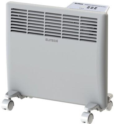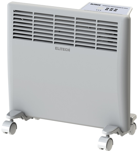 Elitech (Элитеч) ЭК 1000Э это бытовой электрический конвектор мощностью 1 кВт, оснащенный Х-образным нагревательным элементом, датчиком опрокидывания, ионизатором, защитой от перегрева и электромеханическим термостатом. Также модель поддерживает функцию таймера, что позволяет программировать ее работу.