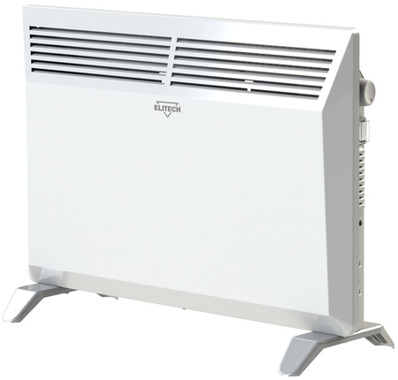 Электрический конвектор Elitech (Элитеч) ЭКН 1500 выполнен в компактном металлическом корпусе белого цвета. Для напольной установки в комплект поставки входят опорные ножки, а для настенного кронштейны. Модель имеет систему защиты от перегрева и встроенный датчик опрокидывания. Количество режимов мощности 2.