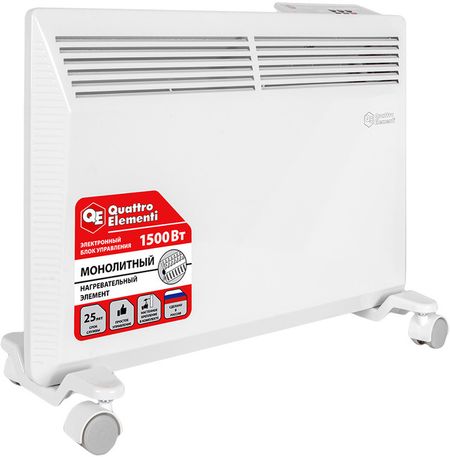 Конвектор QUATTRO ELEMENTI (Кваттро Элемент) QE-1500KME используется для обогрева закрытых бытовых помещений. Устройство оснащается электронным блоком управления, который позволяет настроить температуру, установить таймер, включить ионизатор. Устанавливается на ножки с колесами для удобного и быстрого перемещения.