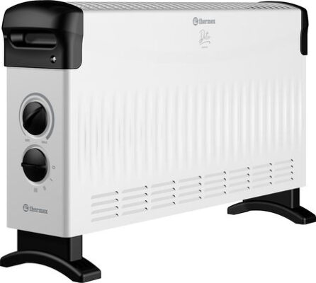 Белый отопительный конвектор Thermex (Термекс) Dateo 2000 White работает от бытовой сети 220В для широкого спектра использования. Устройство устанавливается на пол, а благодаря устойчивым ножкам повышается стабильность использования в различных комнатах. Настройка режима мощности производится через механический термостат.