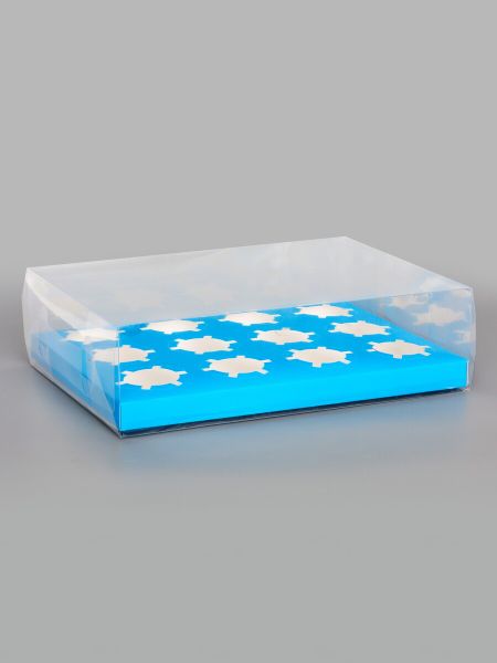 Коробка для 12 капкейков, с прозрачной крышкой, голубой, 34.7×26.3×10 см. Упаковка для капкейков. Изготовлена из плотного картона и PVC. Используют для упаковки и транспортировки капкейков при доставке. Благодаря окошку можно рассмотреть товар внутри коробки, не открывая ее. <br> Коробка имеет гладкую фактуру и текстуру, ее приятно держать в руках. При производстве применяется картон, соответствующий европейским стандартам качества. <br> Упаковка не впитывает жир и устойчива к влаге, поэтому ее внешний вид не пострадает при хранении или перевозке.