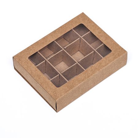 Коробка для 12 конфет, 11.5×8.7×2.5 см, Тонкие разделители, крафт. Кондитерская коробка — это оригинальный вариант оформления конфет и трюфеля в качестве подарка. <strong> Преимущества:</strong> <ul> <li> плотный картон;</li> <li> сохраняет вкусовые качества кондитерского изделия;</li> <li> удобно использовать при транспортировке;</li> <li> ложемент можно достать и использовать как простую подарочную коробку.</li> </ul> Размер ячеек: 2,7х2,7 см.