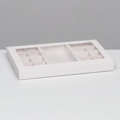 Коробка для 8 + 8 конфет + шоколад, с окном, белая 30×19.5×3 см. Подарочная упаковка с отделениями для 16 конфет и плитки шоколада. <br> Преимущества: <br> — Коробка самосборная и не требует дополнительного скрепления; <br> — Придайте коробке форму, поместите десерт внутрь и задвиньте крышку; <br> — Крышка выполнена в виде прозрачного окошка, которое продемонстрирует ваш десерт; <br> — Изготовлена из целлюлозного картона премиум-класса. <br> Материал полностью безопасен для контакта с пищевыми продуктами.