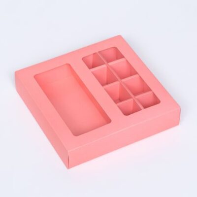 Коробка для 8 конфет + шоколад, с окном, розовая, 17.7×17.7×3.8 см. Кондитерская коробка — это оригинальный вариант оформления конфет и трюфеля в качестве подарка. <strong> Преимущества:</strong> <ul> <li> плотный картон;</li> <li> сохраняет вкусовые качества кондитерского изделия;</li> <li> удобно использовать при транспортировке;</li> <li> ложемент можно достать и использовать как простую подарочную коробку.</li> </ul> Размер ячеек: для шоколада 17,5 х 6,8 см; конфеты 3,5 х 3,5 см.