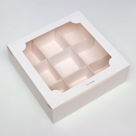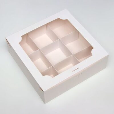 Коробка для 9 пирожных, белая, 24×24×8 см. <strong> Кондитерская упаковка для 9 пирожных, капкейков</strong> — это практичное и стильное решение для упаковки и транспортировки этих вкусных десертов. Изготовленная из прочного картона, эта упаковка обеспечивает надежную защиту пирожных и капкейков от повреждений. Внутреннее пространство разделено на девять ячеек, что позволяет удобно разместить каждое пирожное или капкейк отдельно. Ее элегантный дизайн позволяет видеть внутренний содержимый, создавая аппетитный вид и придавая капкейкам особую презентацию. Выберите эту упаковку, чтобы сохранить свежесть и внешний вид ваших любимых десертов.
