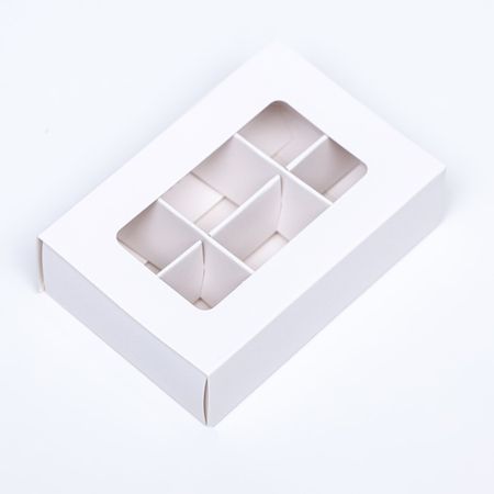 Коробка для конфет 6 штук, 8.7×5.8×2.5 см, Тонкие разделители, белый. Кондитерская коробка — это оригинальный вариант оформления конфет и трюфеля в качестве подарка. Преимущества: -плотный картон; -сохраняет вкусовые качества кондитерского изделия; -удобно использовать при транспортировке; -ложемент можно достать и использовать как простую подарочную коробку. Размер ячеек: 2,5х2,5 см.