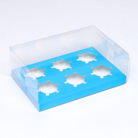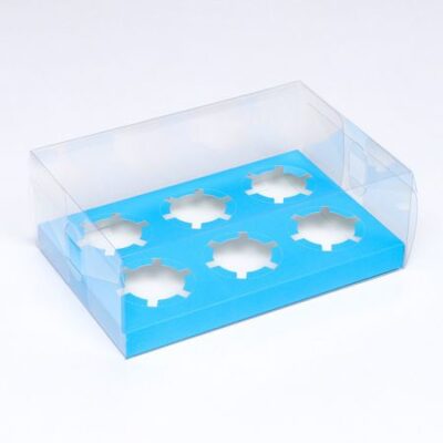 Коробка на 6 капкейков, кондитерская упаковка, голубой 26.8 × 18.2 × 10 см. Упаковка для капкейков. Изготовлена из плотного картона и PVC. Используют для упаковки и транспортировки капкейков при доставке. Благодаря окошку можно рассмотреть товар внутри коробки, не открывая ее. <br> Коробка имеет гладкую фактуру и текстуру, ее приятно держать в руках. При производстве применяется картон, соответствующий европейским стандартам качества. <br> Упаковка не впитывает жир и устойчива к влаге, поэтому ее внешний вид не пострадает при хранении или перевозке.