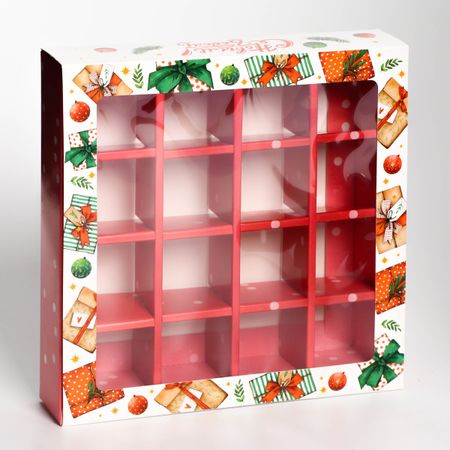 Коробка под 16 конфет «Новогодние подарки», 17.7×17.7×3.8 см. <strong> Коробка под 16 конфет "Новогодняя"</strong> размером 17,7х17,7х3,8 см — это прекрасный выбор для упаковки сладостей к празднику. Она выполнена в ярких новогодних цветах, что создает атмосферу праздника и волшебства. Коробка имеет квадратную форму и состоит из двух частей: верхней крышки и нижней части. Верхняя крышка украшена красивым рисунком, который подчеркивает новогоднюю тематику. Нижняя часть коробки предназначена для размещения конфет. Размеры коробки позволяют упаковать 16 штук конфет, что делает ее удобной для использования в качестве подарка или для домашнего использования. Коробка изготовлена из качественного картона, который обеспечивает надежную защиту содержимого от внешних воздействий. Эта коробка для конфет станет прекрасным дополнением к новогоднему столу или подарком для близких и друзей. Она создаст праздничное настроение и подарит радость всем, кто получит такой подарок.