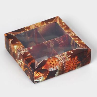Коробка под 4 конфеты «Новогодняя звезда», 12.6×12.6×3.8. <strong> Коробка под 4 конфеты "Новогодняя"</strong> размером 12,6 х 12,6 х 3,6 см — это прекрасный выбор для упаковки сладостей к празднику. Она выполнена в ярких новогодних цветах, что создает атмосферу праздника и волшебства. Коробка имеет квадратную форму и состоит из двух частей: верхней крышки и нижней части. Верхняя крышка украшена красивым рисунком, который подчеркивает новогоднюю тематику. Нижняя часть коробки предназначена для размещения конфет. Размеры коробки позволяют упаковать 4 штуки конфет, что делает ее удобной для использования в качестве подарка или для домашнего использования. Коробка изготовлена из качественного картона, который обеспечивает надежную защиту содержимого от внешних воздействий. Эта коробка для конфет станет прекрасным дополнением к новогоднему столу или подарком для близких и друзей. Она создаст праздничное настроение и подарит радость всем, кто получит такой подарок.