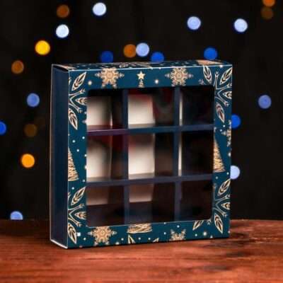 Коробка под 9 конфет «Праздничное волшебство», 13.7×13.7×3.5 см. Новогодняя кондитерская коробка — это оригинальный вариант оформления конфет и трюфеля в качестве подарка. <strong> Преимущества:</strong> <ul> <li> плотный картон;</li> <li> сохраняет вкусовые качества кондитерского изделия;</li> <li> удобно использовать при транспортировке;</li> </ul> ложемент можно достать и использовать как простую подарочную коробку. Размер ячейки: 3,5*3,5 см.