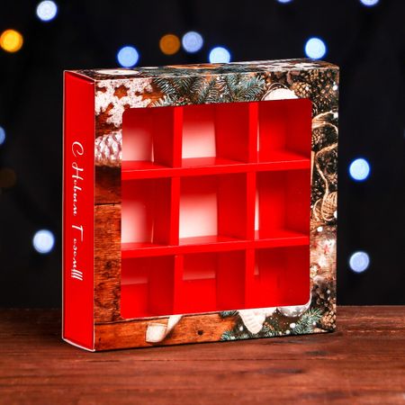 Коробка под 9 конфет «Желанные подарки», 13.7×13.7×3.5 см. Новогодняя кондитерская коробка — это оригинальный вариант оформления конфет и трюфеля в качестве подарка. <strong> Преимущества:</strong> <ul> <li> плотный картон;</li> <li> сохраняет вкусовые качества кондитерского изделия;</li> <li> удобно использовать при транспортировке;</li> </ul> ложемент можно достать и использовать как простую подарочную коробку. Размер ячейки: 3,5*3,5 см.