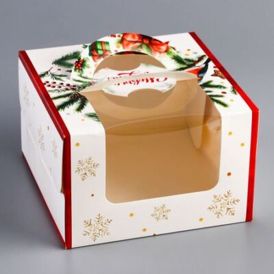 Коробка под бенто — торт с окном «Прекрасного настроения», 15.5×15.5×10 см. <strong> Новогодняя коробка для бенто-торта с окном</strong> — это стильная и праздничная упаковка, разработанная специально для небольших тортов, которые станут идеальным подарком или угощением в зимний сезон. Коробка выполнена из плотного картона, украшенного новогодним дизайном, который создает атмосферу волшебства и праздника. Главной особенностью коробки является прозрачное окно, которое позволяет эффектно демонстрировать бенто-торт, не открывая упаковку, сохраняя его свежесть и аккуратный вид. Внутри коробка снабжена вставкой, обеспечивающей надежную фиксацию торта, чтобы он оставался на месте при транспортировке. Компактный размер коробки делает ее идеальной для порционных тортов, а праздничное оформление — отличным выбором для подарка, новогодних мероприятий или продаж в кафе и кондитерских.
