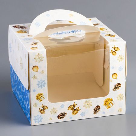 Коробка под бенто — торт с окном «Чудеса случаются», 16×16×12.5 см. <strong> Новогодняя коробка для бенто-торта с окном</strong> — это стильная и праздничная упаковка, разработанная специально для небольших тортов, которые станут идеальным подарком или угощением в зимний сезон. Коробка выполнена из плотного картона, украшенного новогодним дизайном, который создает атмосферу волшебства и праздника. Главной особенностью коробки является прозрачное окно, которое позволяет эффектно демонстрировать бенто-торт, не открывая упаковку, сохраняя его свежесть и аккуратный вид. Компактный размер коробки делает ее идеальной для порционных тортов, а праздничное оформление — отличным выбором для подарка, новогодних мероприятий или продаж в кафе и кондитерских.