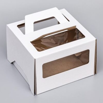 Коробка под торт 2 окна, с ручками, белая, 22×22×15 см