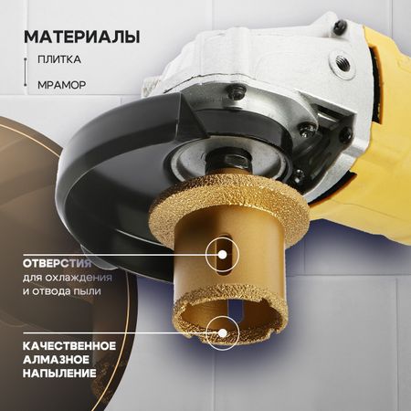 Коронка алмазная ТУНДРА, для УШМ, для отверстий под слив, по плитке, мрамору, 40/60 мм, М14. <em> Идеальный инструмент для точных отверстий!</em> <strong> Алмазная коронка для УШМ</strong> – это надежный помощник для работы с плиткой, мрамором и другими твердыми материалами. Ее эффективность и универсальность делают ее незаменимой для профессионалов и домашних мастеров. <ul> <li> <strong> Чистый рез без сколов:</strong> Алмазное напыление обеспечивает быстрое и аккуратное сверление. Диаметры 40 и 60 мм идеально подходят для создания отверстий под слив или другие коммуникации в керамике, стекле и мраморе.</li> <li> <strong> Простая установка:</strong> Стандартная резьба М14 гарантирует совместимость с большинством углошлифовальных машин. Надежная фиксация обеспечивает стабильность и безопасность при работе.</li> <li> <strong> Долговечность:</strong> Изготовлена из высококачественных материалов, устойчивых к износу. Коронка сохраняет свои свойства даже при интенсивном использовании, что делает ее экономичным выбором.</li> <li> <strong> Универсальность применения:</strong> Подходит для работы с плиткой, мрамором, гранитом и другими твердыми материалами. Высота 64 мм позволяет создавать глубокие и точные отверстия за один проход.</li> </ul> <strong> Почему выбирают этот инструмент?</strong> Алмазная коронка станет незаменимым помощником для плиточников, сантехников и домашних мастеров. Она помогает добиться профессионального результата в работе с любыми поверхностями. Доверьте свою работу инструменту, который всегда работает на вас!