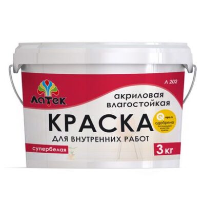 краска акриловая ЛАТЕК Л202 для стен и потолков влагостойкая 3кг белая, арт. 4607067844798