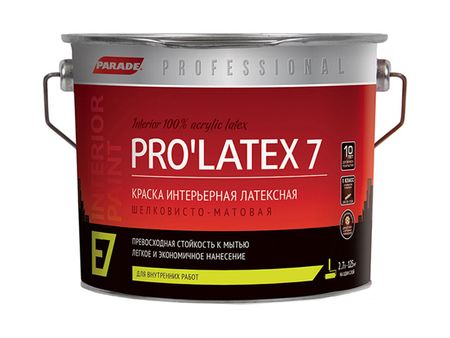 Главная » Строительство и ремонт краска латекс. PARADE PRO’LATEX Е7 база С шелк-мат. 9л, арт.краскаЕ7б.С9л Просмотров 8 PRO’LATEX Е7 база С 9л Латексная Шелк-матовая PARADE
