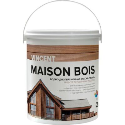 Высокоэффективная краска-лазурь Vincent Maison en Bois предназначенная как для лессировки (тонировки) деревянных поверхностей и их биозащиты, так и для окрашивания (кроющими цветами). Образует сатиновое прочное долговечное покрытие, предохраняющее древесину от плесени, появления синевы, гниения, грибков, насекомых-вредителей. Водоотталкивающее покрытие обеспечивает защиту древесины от мороза и солнечных лучей. Изготавливается в двух базах: база А — пастельные укрывистые цвета, база С — насыщенные укрывистые и лессирующие цвета.