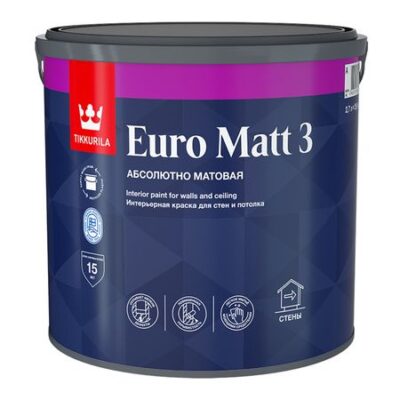 Главная » Строительство и ремонт краска в/д TIKKURILA Euro Matt 3 база A 2,7л белая, арт.700001113 Просмотров 11 EURO 3 База А Объем: 2,7 л Состав: акриловая Степень блеска: глубокоматовая Назначение: для стен и потолков TIKKURILA
