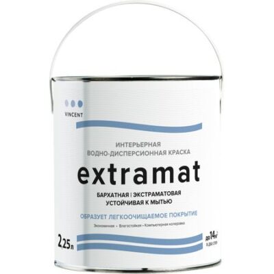 Краска Vincent Extramat образует полуматовое, легко очищаемое, обладающее высокой белизной и влагостойкостью покрытие, устойчивое к обычно применяемым водным растворам моющих средств, сухому и мокрому трению. Интерьерная водно-дисперсионная краска для стен и потолков помещений с повышенной влажностью. Краску наносят на минеральные основания (бетонные, асбестоцементные, цементно-стружечные, кладку из керамического кирпича), ГКЛ, ГВЛ, оштукатуренные (кроме известковых штукатурок) или зашпатлеванные поверхности.