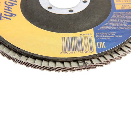 Круг лепестковый торцевой ТУНДРА, 125×22 мм, Р100. Круг лепестковый торцевой ТУНДРА изготовлен из прямоугольных элементов шлифовальной шкурки на тканевой основе, которые расположены в виде веера на подложке из стекловолокна. Применяется в шлифовальных работах по дереву, пластмассе, металлу, и другим материалам.