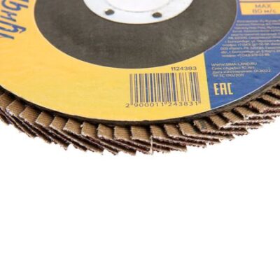 Круг лепестковый торцевой ТУНДРА, 125×22 мм, Р40. Круг лепестковый торцевой ТУНДРА изготовлен из прямоугольных элементов шлифовальной шкурки на тканевой основе, которые расположены в виде веера на подложке из стекловолокна. Применяется в шлифовальных работах по дереву, пластмассе, металлу, и другим материалам.