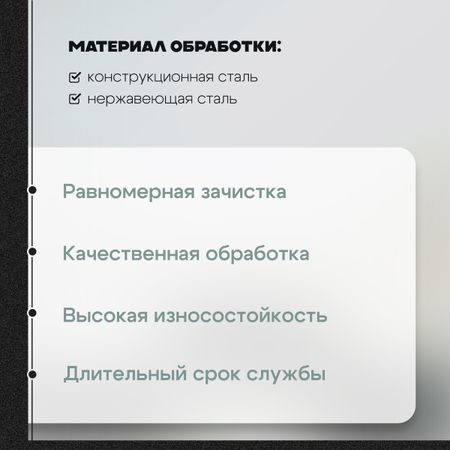 Круг зачистной по металлу ТУНДРА, армированный, 150×6×22 мм. <em> Эффективность и надежность в каждой детали!</em> <strong> Абразивный диск для зачистки металла ТУНДРА 150×6×22</strong> – это ваш надежный инструмент для различных работ по металлу. Обеспечивает качественное удаление ржавчины, старой краски и сварочных швов. <ul> <li> <strong> Оптимальный диаметр — 150 мм:</strong> Идеален для большинства стандартных углошлифовальных машин, обеспечивая широкий захват обрабатываемой поверхности и экономя ваше время на работах.</li> <li> <strong> Посадочный размер — 22 мм:</strong> Диск надежно фиксируется, минимизируя вибрации и повышая точность зачистки.</li> <li> <strong> Толщина диска — 6 мм:</strong> Большая ресурсостойкость и долговечность, идеальна для тяжелых рабочих условий. Прочная конструкция справляется даже с самыми сложными задачами.</li> <li> <strong> Армирование от ТУНДРА:</strong> Увеличивает жесткость, предотвращая разрушения при высокой нагрузке. Это делает ваши работы безопасными и более предсказуемыми.</li> </ul> <strong> Качественное исполнение:</strong> Абразивный круг изготовлен с соблюдением всех стандартов качества, что гарантирует его долговечность и стабильное использование при обработке металлических заготовок. Незаменимый помощник для мастеров, занимающихся сваркой, кузнечными и плотницкими работами. Универсальное решение для всех видов зачистных работ по металлу.