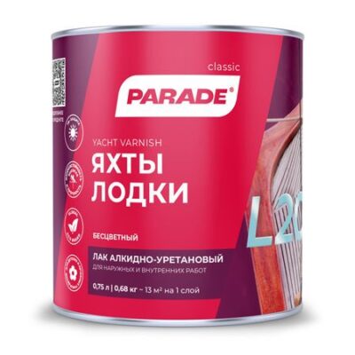 Главная » Строительство и ремонт лак алкидно-уретановый PARADE L20 яхтный глянцевый 0,75л, арт.0006106 Просмотров 11 /PARADE L20/,0,75л,глянцевый, б/цветн.,д/дерев.поверхностей расход 16-18м2/л (на 1 слой) водостойкий,эластичный PARADE