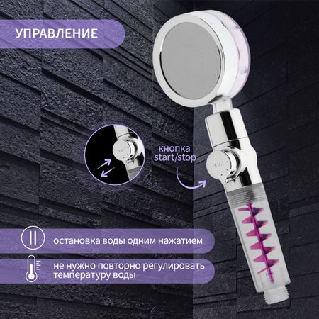 Лейка для душа ZEIN Z4087, микроточки, кнопка «стоп», вентилятор, спираль, фиолетовый/хром. Душевая лейка ZEIN — незаменимая деталь любой современной ванны. Микроскопические точки обеспечивают равномерное распыление воды, а также экономят воду до 40%. У данной модели есть вентилятор в головке и спираль внутри ручки, через которые проходит поток воды, а также кнопка «стоп». Универсальное крепление, совместимое практически со всеми душевыми шлангами.