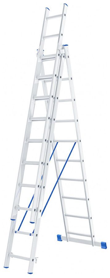 Лестница, 3 х 10 ступеней, алюминиевая, трехсекционнаяПрочная алюминиевая рама из прессованного профиля прямоугольного сечения.Четыре рабочих положения лестницы: стремянка, стремянка с высокой выдвижной секцией, двухсторонняя стремянка, приставная лестница.Устойчивая конструкция и надежная фиксация в рабочем положении.Широкая траверса для устойчивой установки перед началом работы.Оснащены ограничителем безопасности по максимальной высоте.Профилированные ступени с противоскользящим рифлением.Простая сборка и разборка изделия, компактные транспортировочные габариты.Используется в быту — дом, сад, гараж, а так же коммунальной и строительной деятельности.Материал: алюминиевый сплавКоличество секций: 3Количество ступеней: 10Рабочая высота: 5.25 мДлина: 4790 ммМаксимальная нагрузка: 150 кгГабариты в сложенном состоянии: 2840 х 445 х 175 ммВес: 13 кг