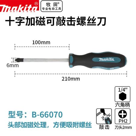 Makita B-66070 Намагниченная выбивная крестовая отвертка PH2 Конусная отвертка с измененными размерами, диаметр 100 мм, диаметр 6 мм