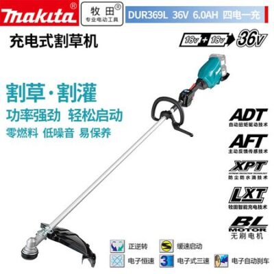 Makita DUR369L литиевая аккумуляторная газонокосилка, режущая щетка, кольцевая ручка для прополки, 36 В, 6,0 Ач, четыре аккумулятора и один заряд