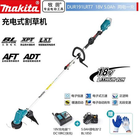 Makita литиевая аккумуляторная газонокосилка, кусторез, кольцевая ручка, 18 В, 5,0 Ач, две батареи, быстрая зарядка DUR191LRT7