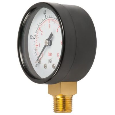 Unipump Манометр радиальный имеет расположение штуцера снизу на боковой поверхности, под шкалой измерения давления воды. Прибор позволяет измерять избыток давления воды либо в системе, либо на выходе насоса. Помимо шкалы измерений давления в бар имеется дополнительная шкала в единицах psi — от 0 до 85-ти. Шкала манометра имеет защитное покрытие от ударов.