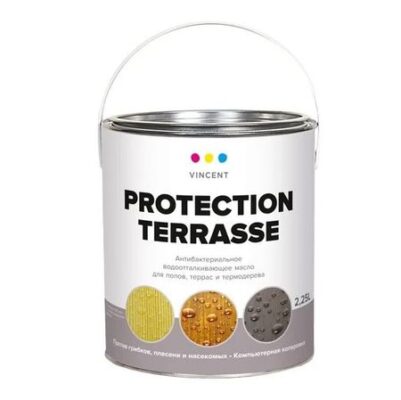 Vincent Protection Terrasse антибактериальное деревозащитное масло, используемое для обработки древесины и термодревесины. Образует прозрачное влагонепроницаемое покрытие, сохраняющее натуральный вид древесного материала. Продлевает период эксплуатации.