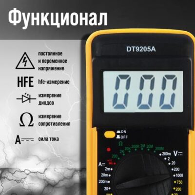 Главная » Строительство и ремонт Мультиметр тундра dt-9205 а, acv/dcv, aca/dca, 200-200mω, 20nf-200mf, прозвон Просмотров 8 Мультиметр ТУНДРА DT-9205 А, ACV/DCV, ACA/DCA, 200-200MΩ, 20nF-200mF, прозвон. Цифровой мультиметр предназначен для измерения тока, напряжения, сопротивления, параметров диодов. Значения отображаются на ЖК-дисплее TUNDRA