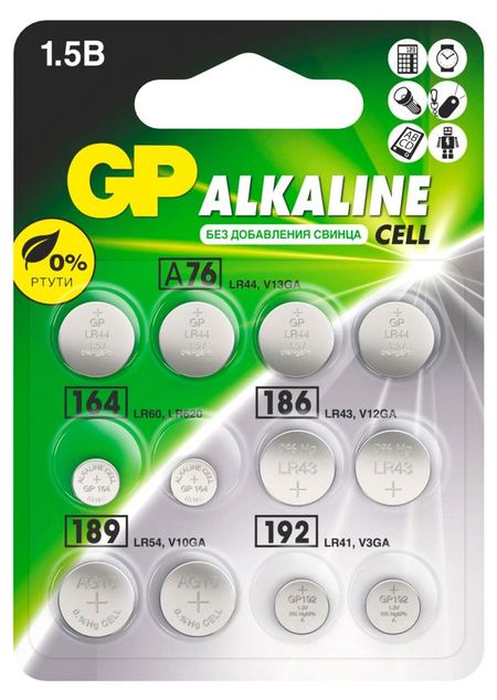 Комплект дисковых элементов питания GP включает в себя 12 марганцево-цинковых батареек различного диаметра и размера. Такие батарейки применяются в калькуляторах, часах, лазерных указках, секундомерах, мини-фонариках, кухонных весах, детских игрушках. Купив одну такую упаковку, вы сможете обеспечить энергией сразу несколько нужных приборов. Дисковые батарейки GP отличаются низким внутренним сопротивлением и стабильным разрядом, благодаря чему долго сохраняют своё рабочее состояние. Срок хранения батареек — 3 года. Устойчивость батареек GP к вибрации и отличные противоударные свойства гарантируют вашим устройствам стабильную работу и безопасность использования в любых условиях