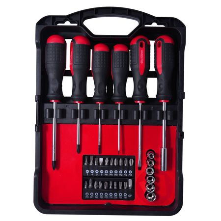 Количество в упаковке: 32 шт. Состав набора: отвертки SL3X75 мм, SL4X100 мм, PH0X75, PH1X75, PH2X100, держатель бит 1 шт., адаптер 1 шт., биты 19 шт.: SL3, SL4, SL5, SL6, PH1-2 шт., PH2 — 3 шт., PH3, PZ1 — 2 шт., PZ2 — 2 шт., PZ3, T15, T20, T25, T30, головки 6 шт.: 5, 6, 7, 8, 9, 10 мм