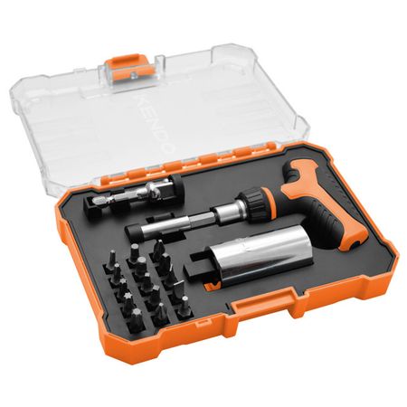 Размер: 168х115х35 мм Материал крышки: поликарбонат Материал корпуса: полипропилен Материал ручки: полипропилен, TPR-резина Количество предметов: 19 Комплектация: биты 6,35х25мм 15 шт: PH2 PH3 SL5 SL6 H3 H4 H5, SQ1 SQ2 PZ2 T10 T15 T20 T25 T30, Т-образная рукоятка с трещоткой удлинитель 60мм, удлинитель гнезда, головки торцевые: 7-19 мм