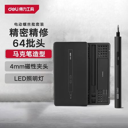 Набор бытовых электрических отверток Deli включает в себя 64 насадки и маркер для точной отделки.
