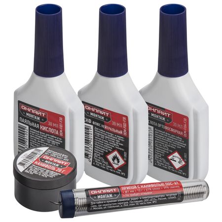 Состав набора: канифоль, паяльная кислота,флюс,ортофосфорная кислота,припой Количество в наборе: 5 предметов Защита от окисления : да Смачиваемость и растекаемость: высокая