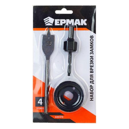 <div>ЕРМАК Набор для врезки замков 4 предмета (сверло д/дерева d-22, державка с центр.сверлом, коронка). Набор для врезки замков ЕРМАК состоит из 4-х предметов, включая перовое сверло с шестигранным хвостовиком, кольцевую пилу и направляющее сверло. Используется для установки замков в дверях из древесины, а также для создания сквозных отверстий в таких материалах как ДСП, ДВП, гипсокартон. Все элементы выполнены из углеродистой стали и имеют высокий запас прочности.</div>