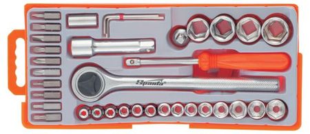 Набор Sparta 13541 содержит 37 предметов для проведения слесарно-монтажных работ. Он оптимально подходит для бытового применения, будет полезен начинающим мастерам. С помощью набора осуществляется монтаж/демонтаж резьбового крепежа. Преимущества Инструменты и сменные насадки выполнены из инструментальной стали и закалены, что обеспечивает им необходимые прочностные характеристики. Широкий ассортимент торцевых головок в наборе позволяет подобрать нужную в зависимости от крепежа. Реверсивная трещотка позволяет осуществлять монтаж и демонтаж резьбовых соединений. В комплект входит пластиковый диск для удобной эксплуатации реверсивной трещотки. Удлинитель на 3/8 дюйма обеспечивает доступ к резьбовым соединениям в труднодоступных местах. Ярко-оранжевый кейс с прозрачной крышкой позволяет удобно хранить и транспортировать набор, он не потеряется среди инструментов.
