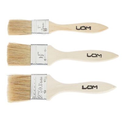 Набор кистей ЛОМ, натуральная щетина, деревянная рукоятка, 1-1.5-2", 25, 38, 50 мм. Набор кистей ЛОМ необходим для точечного прокрашивания небольших деталей или нанесения рисунка. Комплект позволяет устранить недостатки при покрытии стен.
