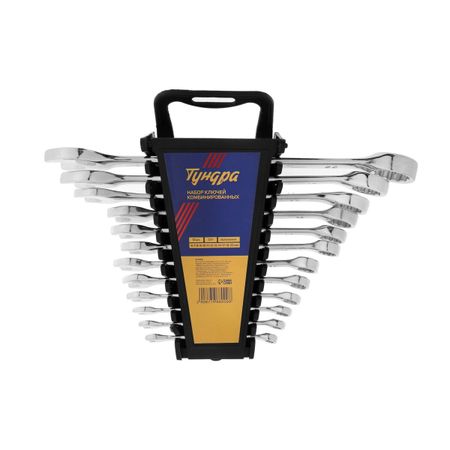 Набор ключей комбинированных в холдере ТУНДРА, CrV, зеркальные, 6 — 22 мм, 12 шт.. Набор ключей зеркальных ТУНДРА предназначен для работ с шестигранным крепежом. В наборе представлены следующие размеры: 6, 7, 8, 9, 10, 11, 12, 13, 14, 17, 19 и 22 мм. Ключи изготовлены из хромованадиевой стали, которая увеличивает прочность, жесткость и устойчивость к износу. Твердость рабочей части составляет 42 HRС. 12-гранный профиль кольцевого зева. Угол наклона кольцевого зева относительно плоскости ключа составляет 15°. Антикоррозийное покрытие защищает инструменты и продлевает срок их службы. Ключи хранятся в специальном холдере, с помощью которого инструменты удобно хранить и транспортировать.