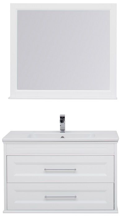Комплект мебели Aquanet Бостон Flat 100 белого цвета интересен внешне. Фрезеровка по белоснежным матовым фасадам и по боковым частям тумбы придает внешнему виду изделия шириной 100 см достойный и благородный вид, свойственный классике. Но утонченные ручки производства известной турецкой фирмы System, словно ниточки поблескивающие на фасадах, визуальная легкость изделия напоминает о модерне. Тумба с двумя выдвижными ящиками, оборудованными доводчиками производства компании Hettich (Германия), вмещает огромное количество полезных вещей. В верхнем ящике предусмотрено три отделения, что делает его пространство более удобным для использования: все вещи будут на своих местах. Нижний ящик просторный и в него можно поставить многочисленные шампуни, гели, муссы, маски, кремы и другие емкости. Модель имеет два варианта монтажа. Базовый – подвесной. Кроме того, специально для этой коллекции были разработаны очень элегантные ножки, выполненные из массива и окрашенные в белый цвет. Входящее в комплект зеркало оправлено в изящную рамку из МДФ с небольшой полочкой внизу длиной 100 см.