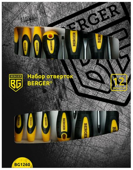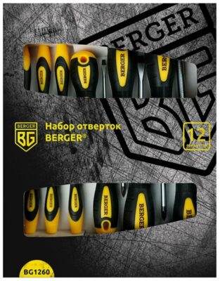 Набор отверток 12 предметов Berger BG BG1260 включает востребованные типы наконечников и размеры резьбы. Комплект выполнен из качественной стали: твердость материала 51-54 HRC, CR-V 6150.Технические характеристики: Тип наконечника: Phillips (PH)/Slotted (SL) Материал рукояти: двухкомпонентная Для точных работ Длина стержня, мм: 150 Форма ручки: Прямая Количество в наборе, шт: 12 Габариты без упаковки, мм: 310х210х50 Материал стержня: CrV Тип шлица: SL1.2, 2, 3, 4, 6.5, 8; PH000-0-1-2Комплектация: Отвертка шлицевая: SL4 x 100мм; SL6.5 x 100мм; SL8 x 150мм; Отвертка крестовая: PH2 x 38мм; PH2 x 100мм; PH1 x 75мм; Отвертка шлицевая точная: SL1.2 x 50мм; SL2 x 50мм; SL3 x 50мм; Отвертка крестовая точная: PH000 x 50мм; PH0x 50мм; PH1 x 50мм; Упаковка.