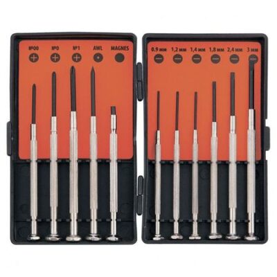 Набор отверток Sparta, 11 предметов, используется для точной механики при осуществлении монтажа/демонтажа микровинтов со шлицами SL и PH. Он рассчитан на несложные бытовые работы, может применяться в частной мастерской. С помощью набора легко ремонтировать мелкие бытовые приборы, очки, часы и т. д. Преимущества: Удобство и точность работы — отвертки оснащены вращающимися затыльниками; Стальные рукоятки с рифлением — отвертки не скользят в руке; Безопасное хранение и транспортировка — детали набора размещены в пластиковом кейсе с ложементом.